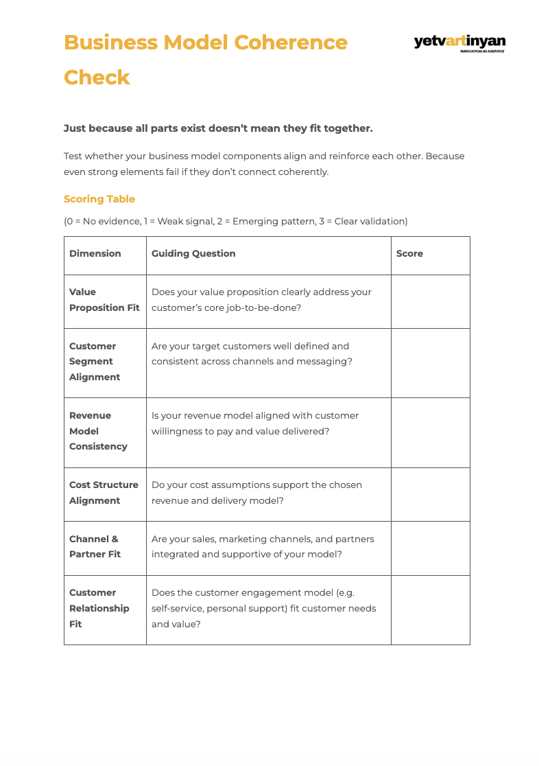 Test whether your business model components align and reinforce each other. Because even strong elements fail if they don’t connect coherently.