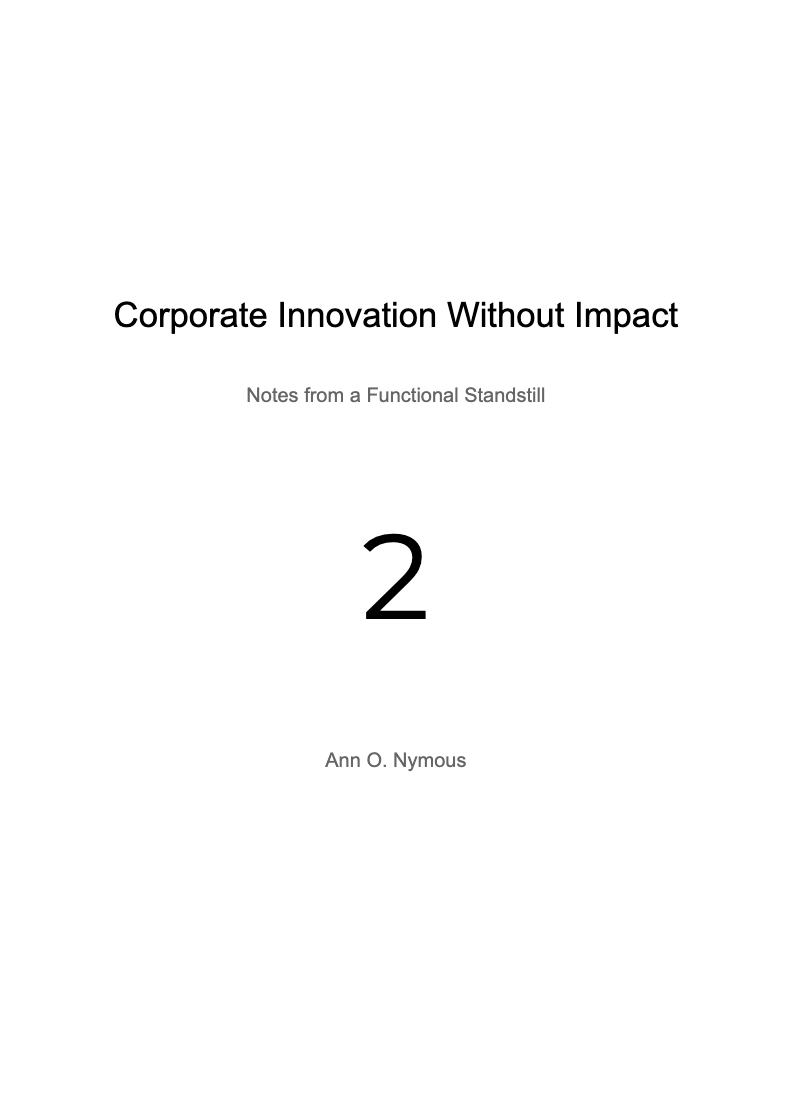 1 ebook (PDF) Corporate Innovation Without Impact — Notes from a Functional Standstill A short-form book on innovation without effect, written in a dry, controlled tone with restrained dark humor. 30 chapters Each chapter focuses on a recurring organizational pattern (alignment, governance, process, ownership, metrics, roadmaps, initiatives) and shows how activity accumulates while outcomes remain unchanged. ~35,000–40,000 words Dense, precise prose. No filler, no storytelling arcs, no motivational language. Standalone reading Chapters can be read independently or as a continuous record of the same system at work. No advice, no frameworks This is not a guide to better innovation. It does not propose solutions or improvements. It documents functional standstill. Fictive, close to reality All situations are fictional, but deliberately familiar. Any resemblance is incidental and difficult to avoid. Anonymous author Written under a pseudonym to keep the focus on patterns, not people. Instant download DRM-free PDF for personal use.