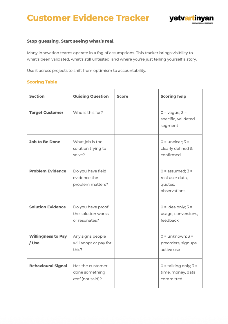 Many innovation teams operate in a fog of assumptions. This tracker brings visibility to what’s been validated, what’s still untested, and where you’re just telling yourself a story.