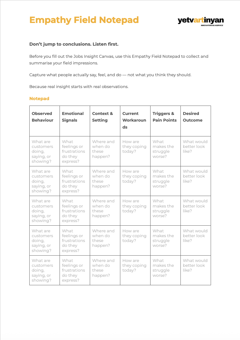Before you fill out the Jobs Insight Canvas, use this Empathy Field Notepad to collect and summarise your field impressions. Capture what people actually say, feel, and do — not what you think they should. Because real insight starts with real observations.