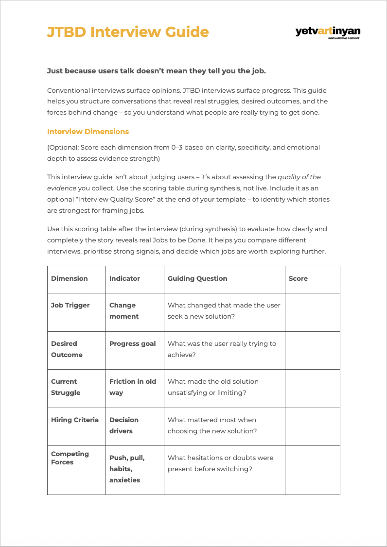 Conventional interviews surface opinions. JTBD interviews surface progress. This guide helps you structure conversations that reveal real struggles, desired outcomes, and the forces behind change – so you understand what people are really trying to get done.