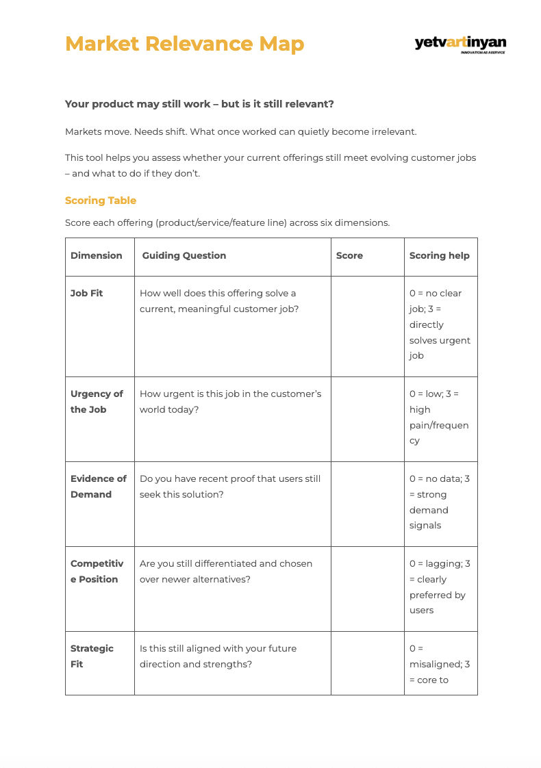 Markets move. Needs shift. What once worked can quietly become irrelevant. This tool helps you assess whether your current offerings still meet evolving customer jobs – and what to do if they don’t.