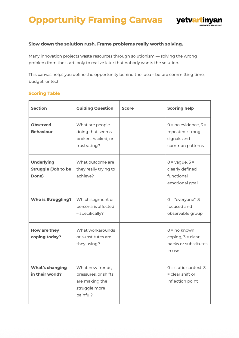 Many innovation projects waste resources through solutionism — solving the wrong problem from the start, only to realize later that nobody wants the solution. This canvas helps you define the opportunity behind the idea – before committing time, budget, or tech.