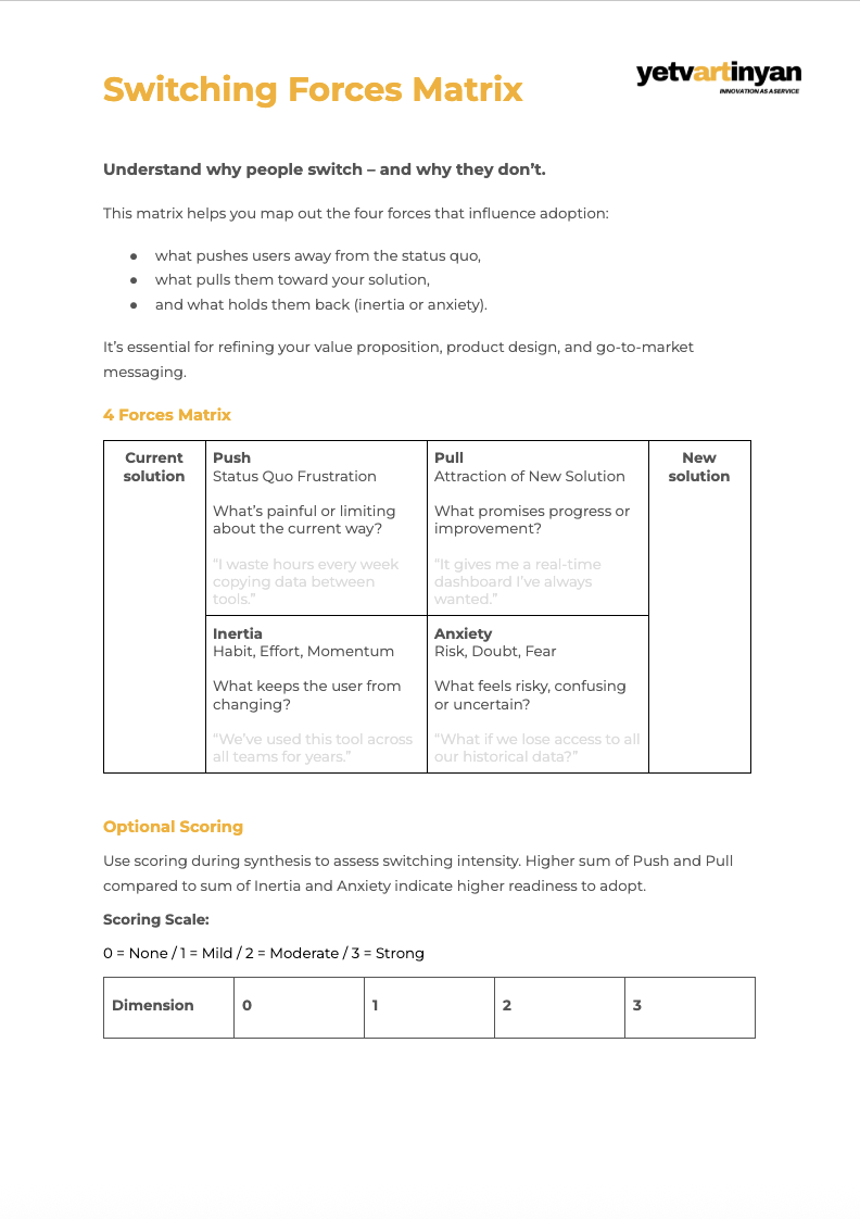 This matrix helps you map out the four forces that influence adoption: what pushes users away from the status quo, what pulls them toward your solution, and what holds them back (inertia or anxiety). It’s essential for refining your value proposition, product design, and go-to-market messaging.