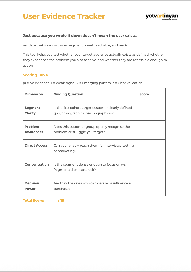 Validate that your customer segment is real, reachable, and ready. This tool helps you test whether your target audience actually exists as defined, whether they experience the problem you aim to solve, and whether they are accessible enough to act on.